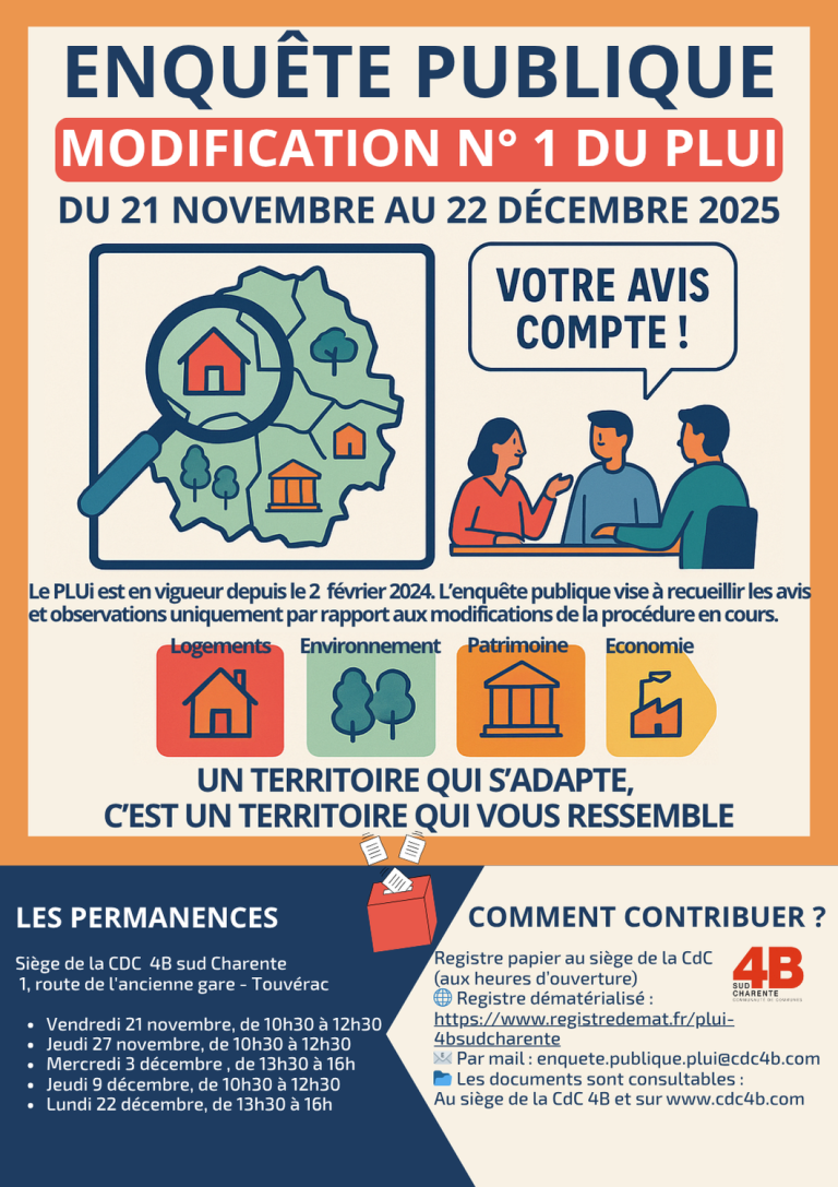 enquête publique sur la modification n°1 du Plan local d’urbanisme intercommunal (PLUi) de la Communauté de communes 4B sud Charente, en vigueur depuis le 2 février 2024